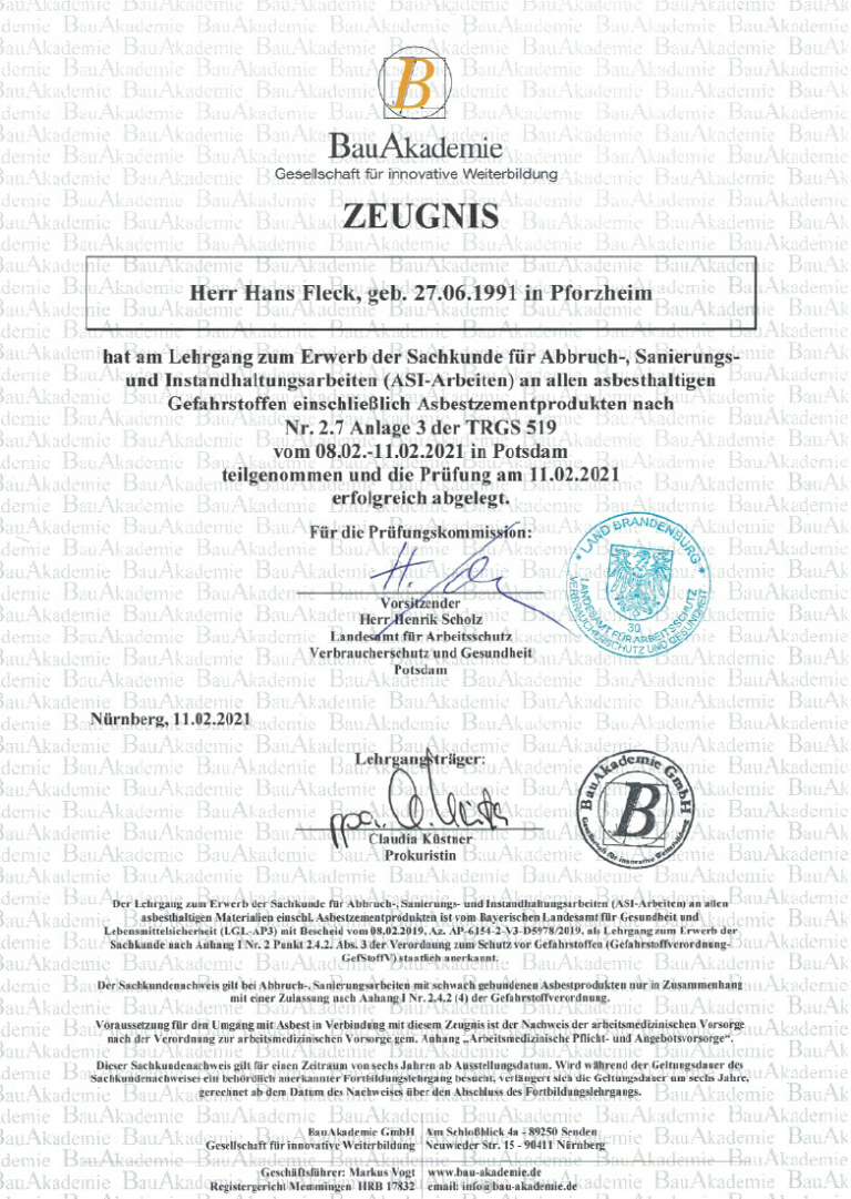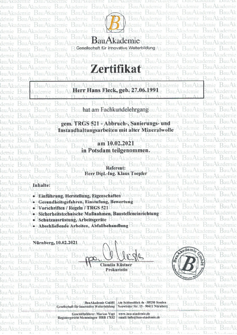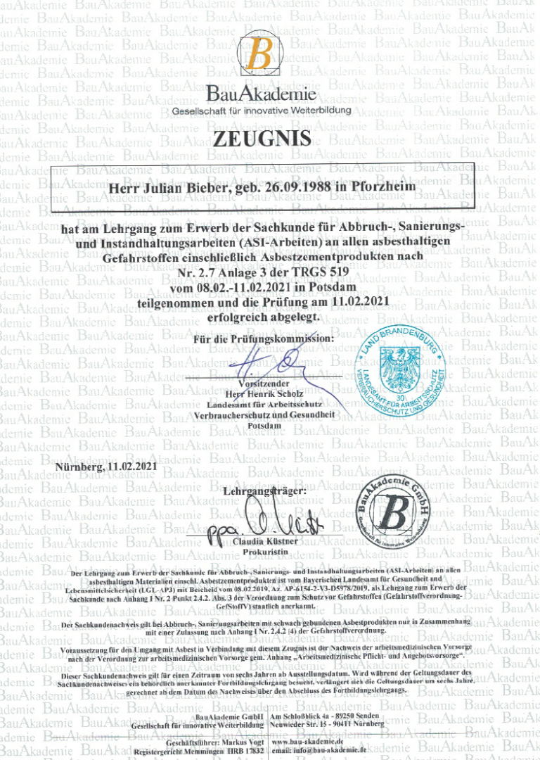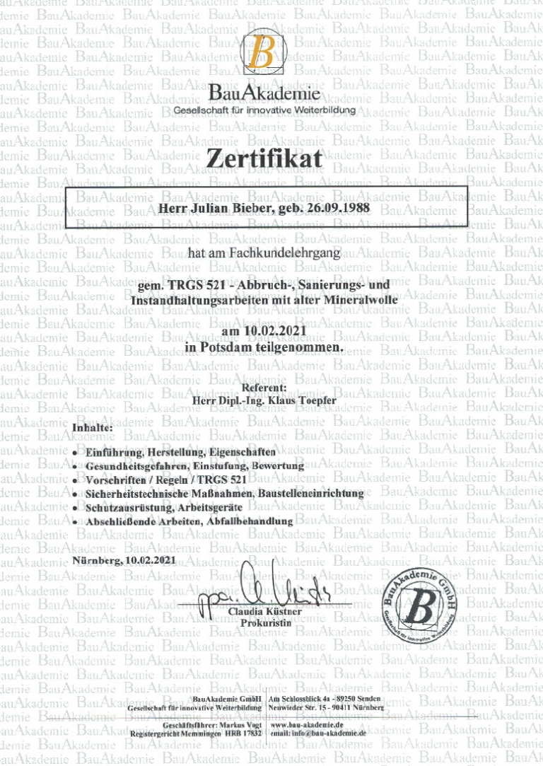 Über 20 Jahre Erfahrung und alle relevanten Fachzertifizierungen für Abbruch und Schadstoffsanierung.