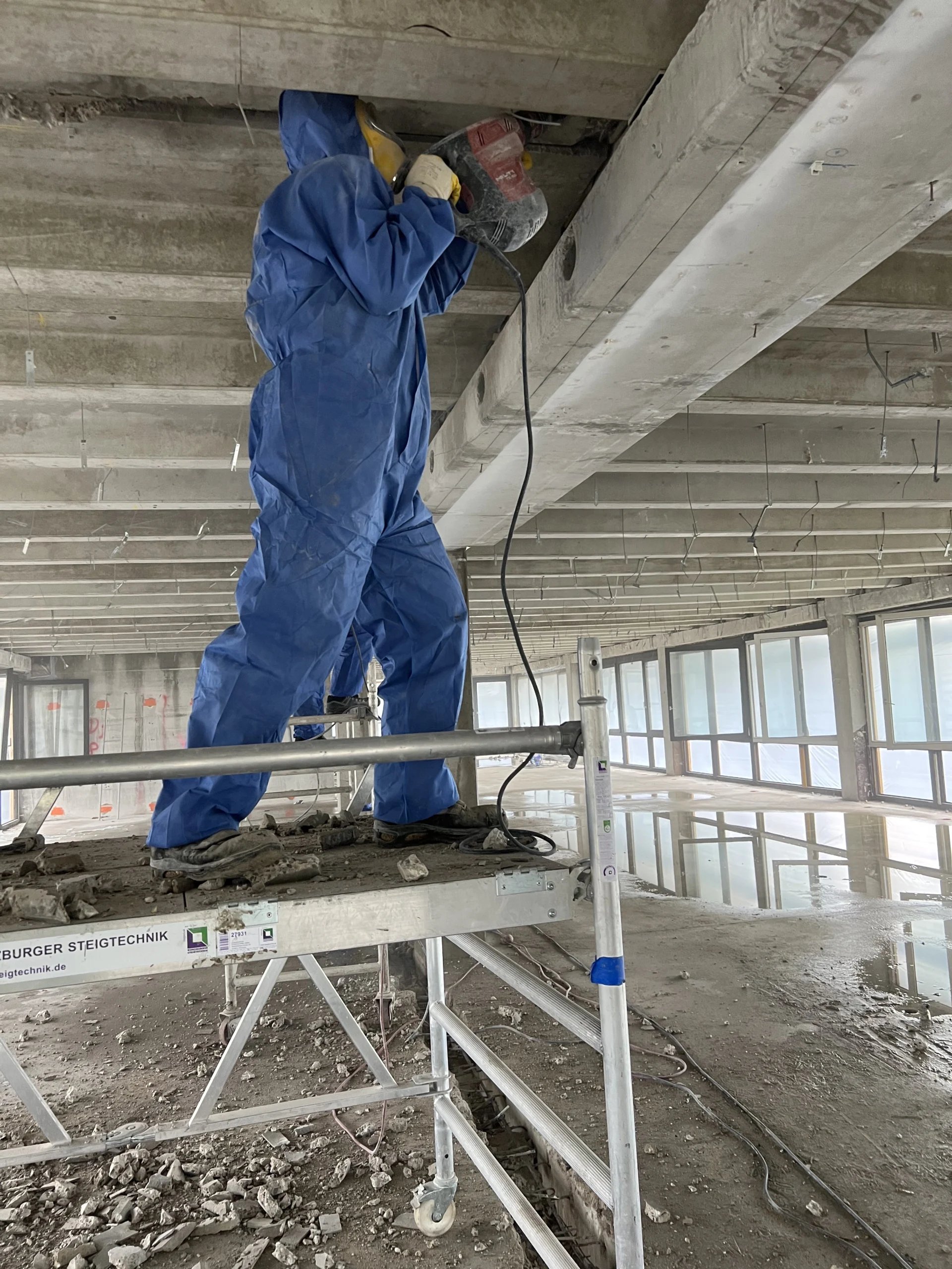 Besonderheit des Projekts war die Demontage von asbesthaltigen AZ-Platten zwischen zwei übereinanderliegenden Schwarzbereichen – eine technisch anspruchsvolle Ausführung, die präzise Planung und zertifiziertes Fachpersonal erforderte. Zum Einsatz kam ein gesamt Volumen der Unterdruckhaltegeräte von 40.000 m3/h.